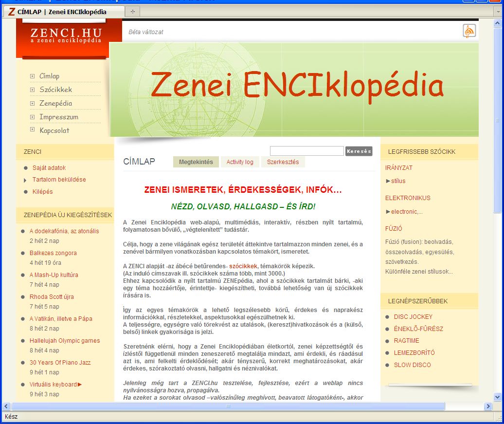 A Zenei Enciklopédia web-alapú, multimédiás, interaktív, részben nyílt tartalmú, folyamatosan bővülő, „végtelenített” tudástár.